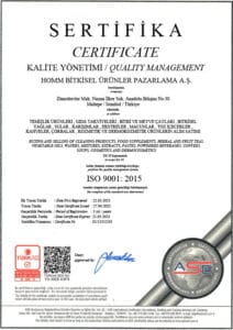 - Kalite Yönetimi: ISO 9001 ISO 9001 Kalite Yönetimi Belgesi, Homm Bitkisel’in her bir ürününü en üst kalite standartlarına uygun bir şekilde üretme kararlılığını gösteriyor. Evinize getirdiğimiz kaliteyle, günlük yaşamınızda doğallığın tadını çıkarabilirsiniz.